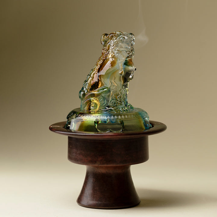 The Guardian Lion Glass Incense Burner is a stunning fusion of traditional symbolism and modern craftsmanship. Sculpted from translucent colored glass, the lion—known as a guardian of peace and power—sits majestically atop the incense lid, reflecting light in shimmering shades of amber and emerald. The dark wooden base complements the brilliance of the glass, creating a serene yet powerful presence. Ideal for meditation spaces, tea rooms, or as an artistic collectible.