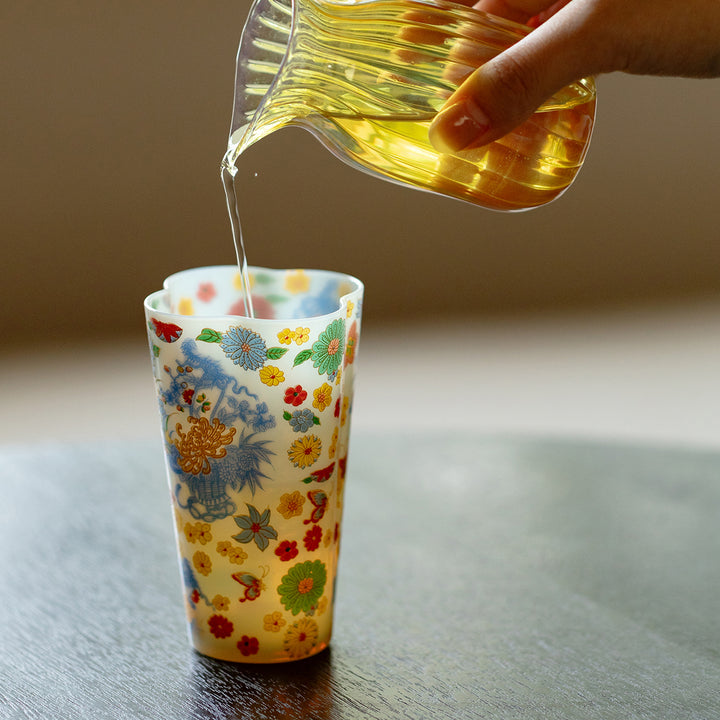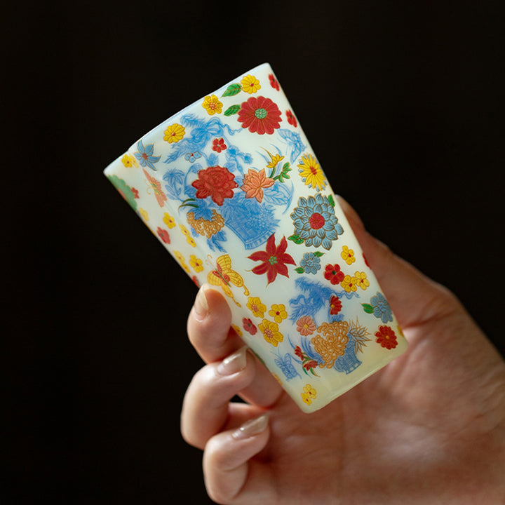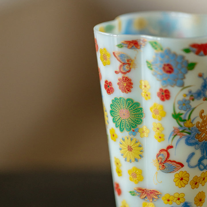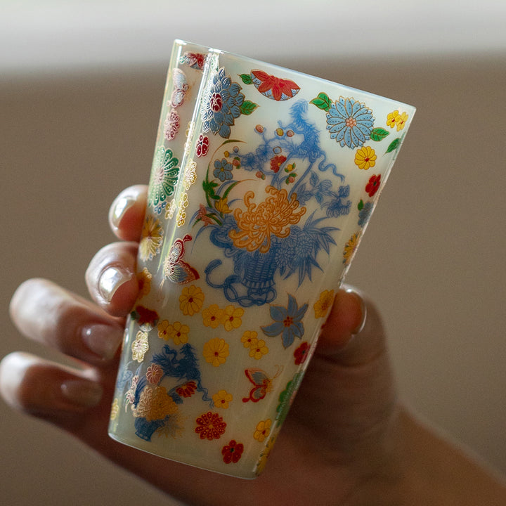 The Imperial Garden Bloom Cup brings the elegance of traditional Chinese porcelain into your everyday rituals. Decorated with vivid hand-painted florals and butterflies, it symbolizes prosperity and joy. The delicate translucent body and intricate cobalt detailing evoke the charm of antique famille-rose ware while fitting beautifully into a modern table setting. Ideal for tea, coffee, or display.